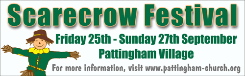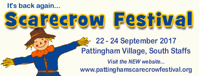 Help us promote your Scarecrow Festival with a car sticker... ![]() download here >> If you unable to download and print the Scarecrow car sticker, don't worry, just call Mike Coope on 01902 700426 and he will print one for you. Start your Scarecrow Trails from the Village Hall... ![]() with the SCARECROW TRAIL GUIDE... When you visit be sure to buy your SCARECROW TRAIL GUIDE at the START outside the Village Hall, at £2 per person with children under 16 FREE. This TRAIL GUIDE is a map showing all scarecrow positions together with their title and the three suggested viewing routes. SCARECROW FESTIVAL OPEN TIMES Friday 27th - 12.00 noon to 5.00pm Saturday 28th - 10.00am to 5.00pm Sunday 29th - 10.00am to 5.00pm Ample FREE parking near the Church All vehicles are parked on the allocated car parks entirely at the owner's risk. Hungry or thirsty ? Refreshments of savoury rolls, homemade cakes, ice cream and drinks are available daily in the Village Hall up to 4.30pm. Evening Entertainment... Again Festival entertainment is being planned and so far we can tell you that on Friday evening September 27th there will be the traditional Harvest Supper with a talk by Rob Colin-Stokes, and on Saturday 28th there is to be a Folk Night featuring "Pro Tempore", the well known and popular group, with a Harvest Festival services in St Chads Church on the Sunday evening. For up-to-date information of the Festival, call Chrissie Ringrose on 01902 700340 or visit the Church website at www.pattingham-church.org Steering