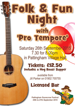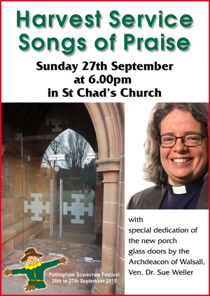 ![]() FOLK & FUN NIGHT with 'PRO TEMPORE' SATURDAY EVENING - 26th at 8.00pm Saturday evening sees the popular and talented group 'Pro Tempore' performing folk music mingled with good fun and ready banter. There will also be a Hog Roast Supper during the interval. A licensed bar will also be operating. To order your tickets, call Jill Parker on 01902 700755 or email her at jill.parker4@btinternet.com, but don't delay because this event will also be very popular. SOLD OUT ! ![]() HARVEST SERVICE SONGS OF PRAISE SUNDAY EVENING - 27th at 6.00pm The 6.00pm Evensong will be a special service for Harvest together with a Songs of Parise and will mark the final event of the Scarecrow Festival. Within the service, will be the dedication of the new glass porch by the Ven. Dr. Sue Weller, the Archdeacon of Walsall. The financing of these new doors was mainly derived from the previous Scarecrow Festivals that took place in 2011 and 2013. The church