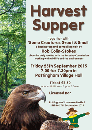 ![]() HARVEST SUPPER and a talk of SOME CREATURES GREAT AND SMALL FRIDAY EVENING - 25th at 7.30pm Our first evening event is on Friday 25th September 2015. This will be the HARVEST SUPPER together with an illustrated talk entitled 'Some Creatures Great and Small' by Rob Colin-Stokes, who is Pattingham born and bred. Rob works for the Forestry Commission and will tell us about his daily routine working with wild life and the environment. Don't miss what will surely be a fascinating and compelling talk. Tickets are just £7.50 each which includes a hot Harvest Supper and Sweet cooked by Sue Riches, well known in Pattingham for her excellent recipes. There will also be a licensed bar. To order your tickets, call Liz Sampson on 01902 700823 but don't delay because this event will be popular.